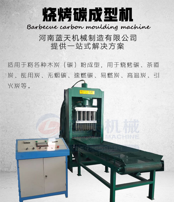 河南藍天機械制造有限公司設(shè)計的燒烤碳成型機,采用上下液壓,上壓120T,下頂120T,因為壓力的作用,做出來的燒烤碳密度大,無煙、易燃,所以也被稱為液壓燒烤碳成型機,無煙燒烤碳成型機,形狀外觀可以根據(jù)用戶的要求定做。