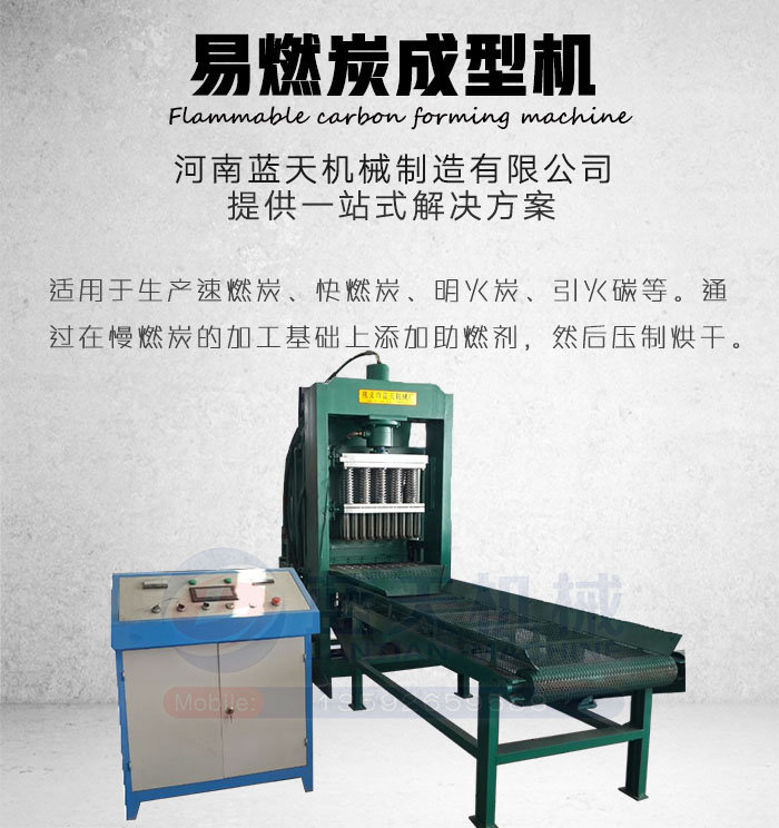 易燃碳成型機是由河南藍天機械制造有限公司運用轉化技術,將生物質材料經(jīng)炭化粉碎后成型的成型設備。易燃炭是為方便野外燒烤使用而生產(chǎn)的一種速燃炭、引火碳、快速點火碳等,主要用于戶外燒烤快速引燃。易燃碳成型機可以方便的調(diào)換摸具,以便生產(chǎn)各種形狀尺寸的易燃炭,目前市場上常見的易燃炭分為圓柱形和蜂窩煤形。通過調(diào)換模具能生產(chǎn)出生產(chǎn)圓形、方形、梅花形、扇形、中心有孔無孔等特殊形狀。河南藍天機械制造有限公司一站式提供各種技術配方,為用戶規(guī)劃場地、現(xiàn)場指導、安裝調(diào)試。